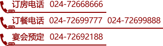 訂房電話(huà) 024-72668666 訂餐電話(huà) 024-72699777 72699888 宴會(huì)預(yù)定 024-72692188